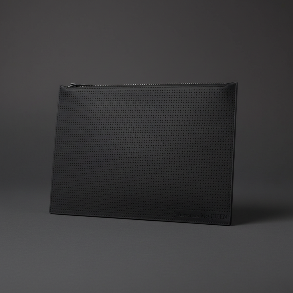 Crafted from perforated black leather, this Alexander McQueen flat pouch combines refined design with practical organization. Featuring black hardware and a top zipper, it opens to a black fabric interior equipped with a patch pocket and six card slots, ensuring your essentials stay secure. Ideal for parties and special occasions, this clutch embodies the iconic elegance and craftsmanship synonymous with Alexander McQueen.